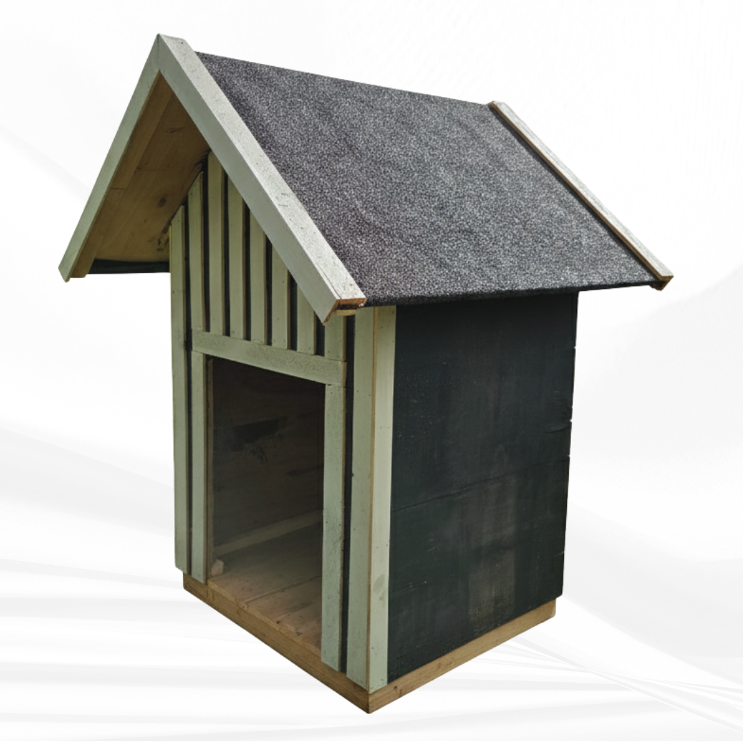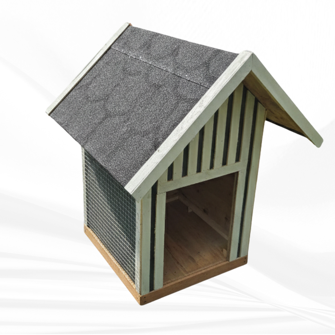 Bu modern tasarımlı ahşap köpek kulübesi, hem estetik görünümü hem de sağlam yapısıyla köpeğiniz için güvenli ve konforlu bir yaşam alanı sunar.